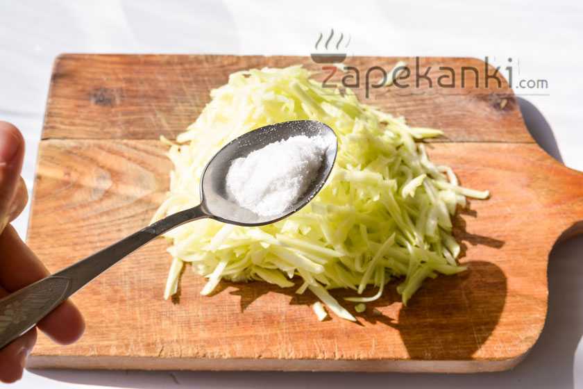 - Нарезанные кольцами кабачки солим и оставляем на 10 минут для выхода жидкости.