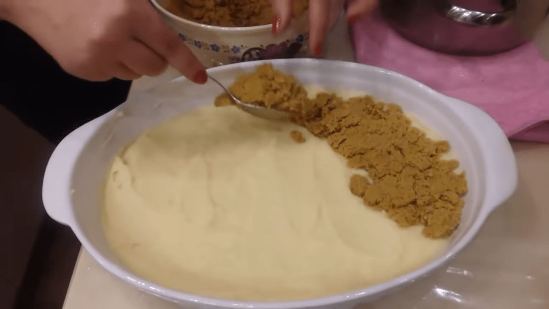 Через 30 минут форму вынимаем, заливаем заливкой и снова отправляем в духовку, запекаем при 200С . примерно 20 минут до золотистого цвета.