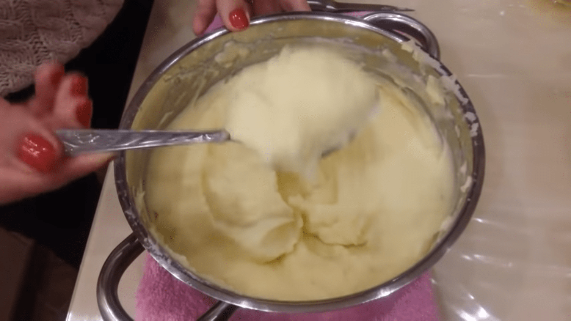 - Картошку отвариваем, солим, сливаем жидкость, в которой она варилась в чашку (можно будет долить для получения нужной консистенции). Наливаем горячее молочко, хорошо толчем картошку, чтобы не было комочков. Можно воспользоваться погружным блендером. Слишком жидко не делайте. Вбиваем яйца, тщательно перемешиваем, чтобы они не свернулись в горячей массе.