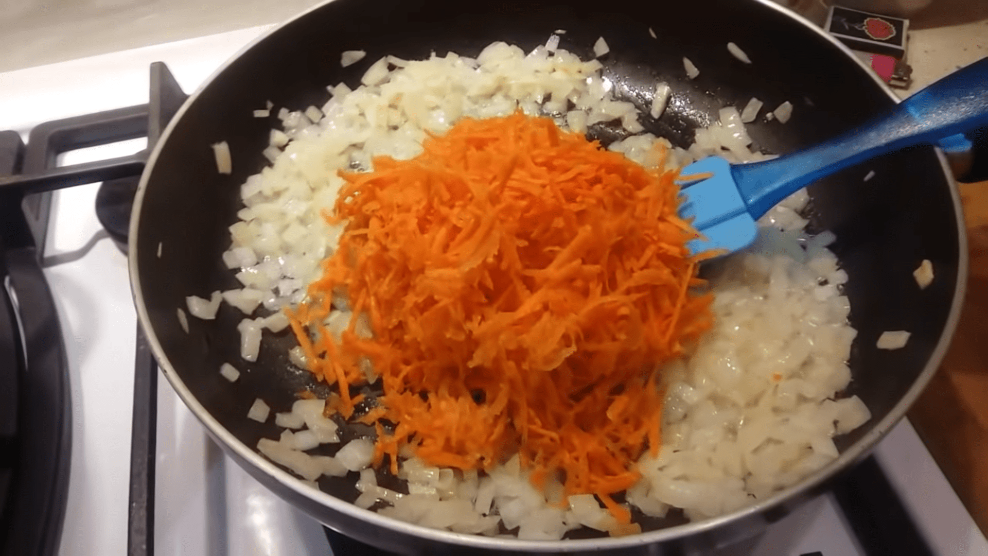 В сковородке прогреть рафинированное масло, переложить лук с морковкой. Помешать и обжаривать несколько минут. Главное проследить за тем, чтобы овощи не сгорели, а приобрели красивый золотистый цвет.