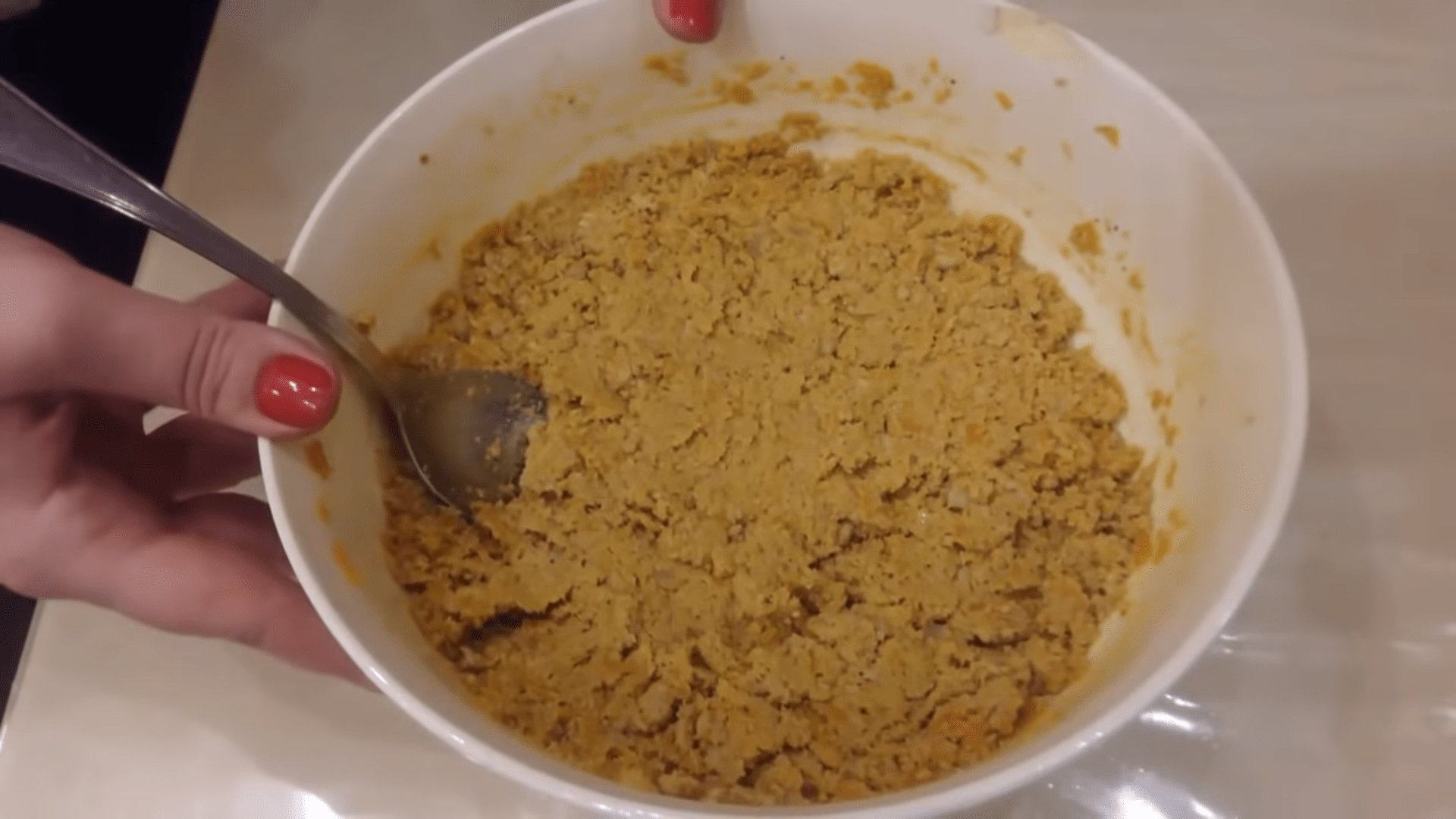 - В миску выбейте 3 яйца, взбейте их венчиком и добавьте к пюре.