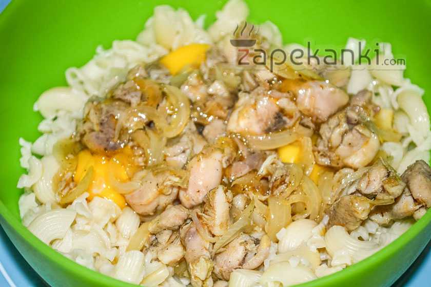 5. Если используете копченое филе — просто нарежьте его. А если остановили выбор на свежем курином мясе, то его нужно обжарить с луком до готовности на небольшом количестве растительного масла. Причем лучше использовать куриную грудку, поскольку на ней еще кожица с жировой прослойкой, филе будет не таким сухим. Копченое или обжаренное филе с луком полностью остужаем и добавляем в миску к макаронам с яйцами. Между делом ставим разогреваться духовку до 180 градусов.