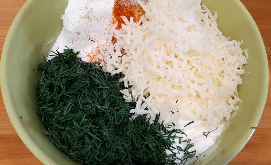После чего выложите в форму для запекания и равномерно распределите по всей поверхности. Твердый сыр натрите на мелкой терке и присыпьте запеканку сверху. Зелень вымойте и обсушите, нарубите ножом и присыпьте запеканку. Снова перемешайте.