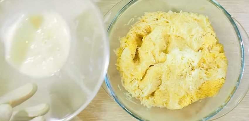 3. Картофель немного отожмите и вмешайте к нему яйцо, посолите.