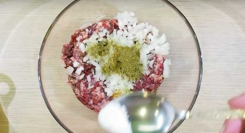 2. Лук порубите кубиками и смешайте его с мясным фаршем, добавьте специи, соль и все перемешайте.