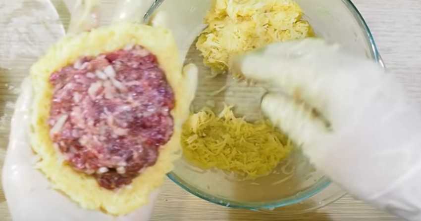 6. На ладони распределите одну из таких частей тертой массы. На нее выложите мясо и сверху накройте картошкой. Слегка приплюсните колобок.