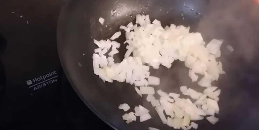 5. Через 3-5 минут заложите лук. Еще через пару минут внесите специи, лавровый лист и соль.
