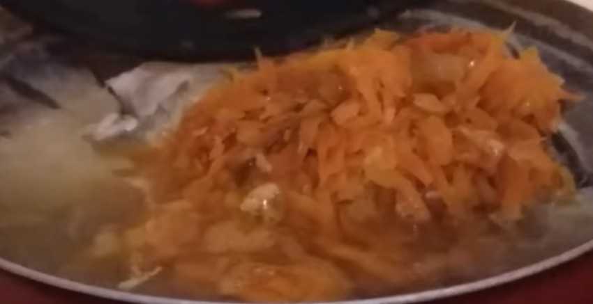 - Слейте бульон, процедите его, верните в кастрюлю, заложите лук с морковью. Рыбку разберите на кусочки, выбросив кости.