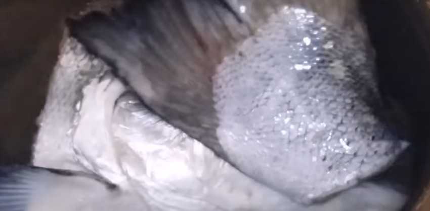 - Голову рыбы тщательно очищаем от жабр. Они в рыбе быть не должны. Аккуратно вытаскиваем жабры. Удаляем глаза. Хорошо промываем голову в проточной воде;