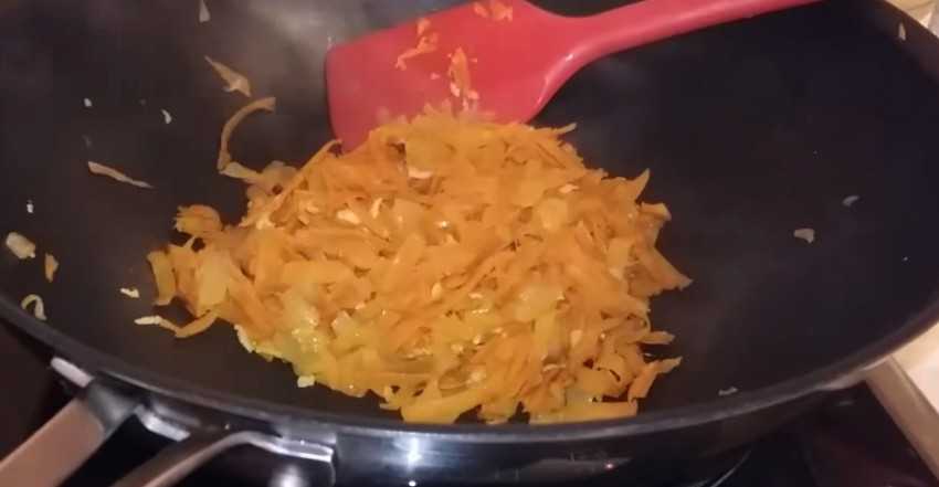 - Параллельно в другой кастрюле с толстым дном разогрейте постное масло, выложите нарезанные кубиками репчатый лук и морковь. Обжарьте овощи до легкого золотистого цвета.