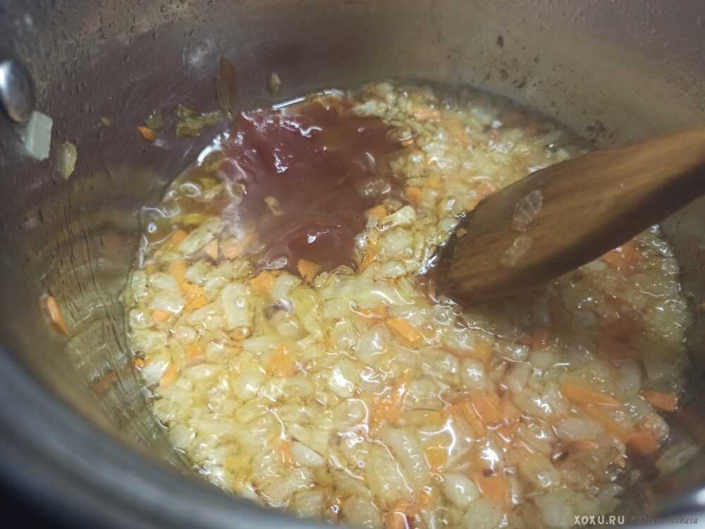 - Приготовить зажарку из лука, морковки и свёклы, добавив несколько ложек бульона и томатную пасту. Посолить, поперчить заправку и оставить на 10-15 минут, чтобы настоялась.