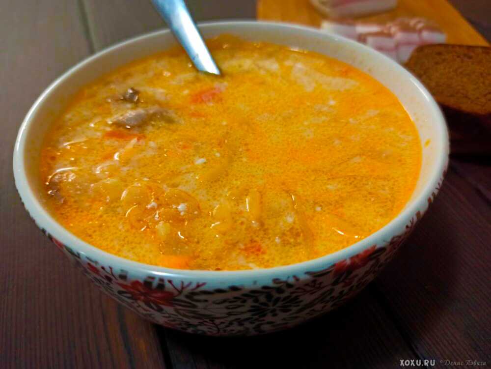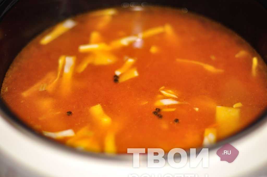 - Когда останется полчаса до приготовления мяса — заложите в суп обжарку.