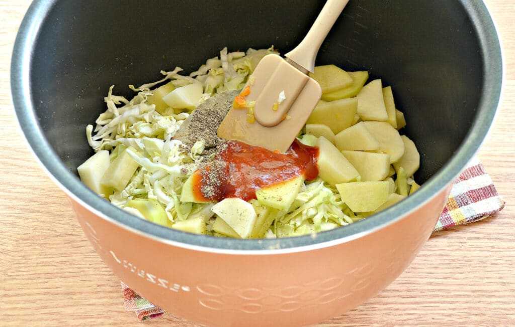 Заготовку из капусты и картофеля выкладываем в съемную чашу мультиварки. Добавляем специи, выкладываем томатную пасту, лавровый лист.