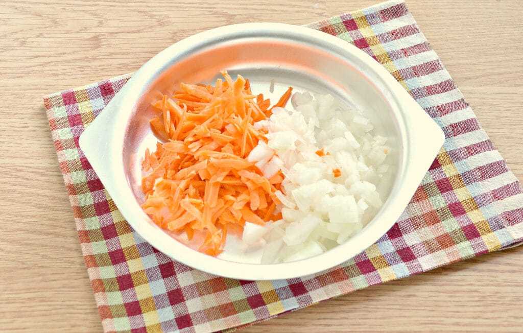 Следом за мясом добавить промытую крупу, по желанию можно заменить её вымоченной и немного проваренной перловкой. Очищенную морковку и луковицу нарезать не слишком мелкой соломкой и спассеровать до потери луком матового цвета.