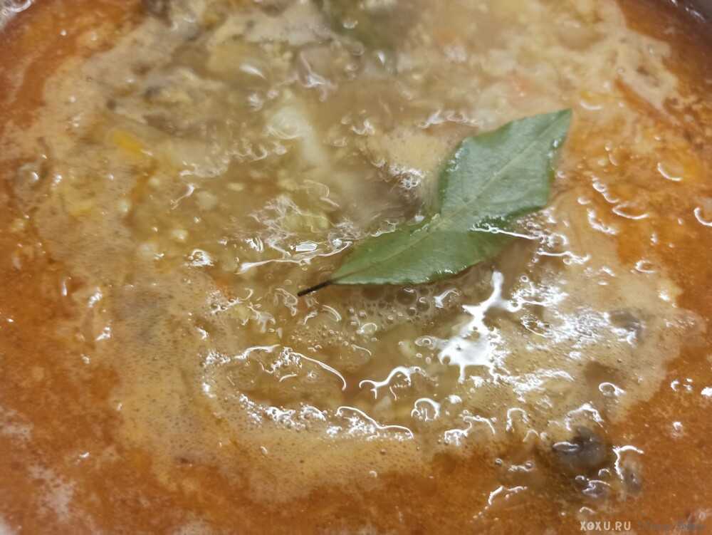 В кипящий бульон, когда крупа будет почти уже готова, положить отжатую капусту, зажарку и специи. Варить до готовности и только потом посолить.