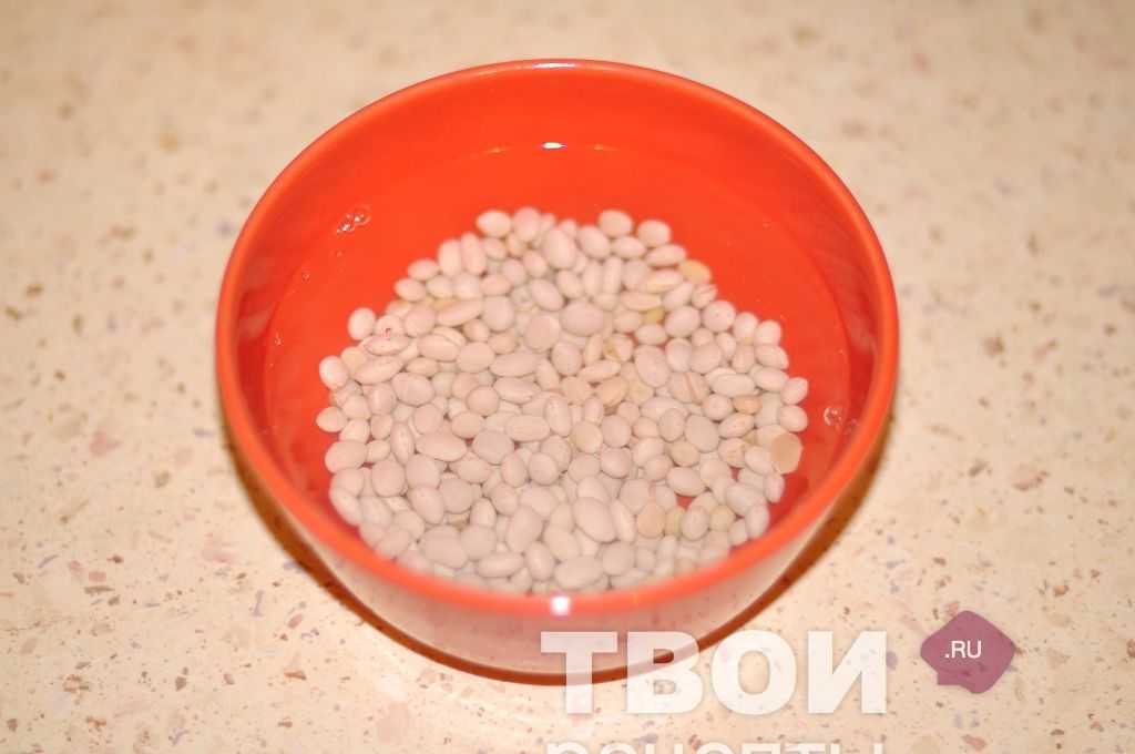 Замоченную на ночь фасоль промыть в дуршлаге, залить вместе с мясом водой и варить на минимуме нагрева, до готовности обоих продуктов. Свинину вынуть, отделить от кости, нарезать и вернуть в кастрюлю.