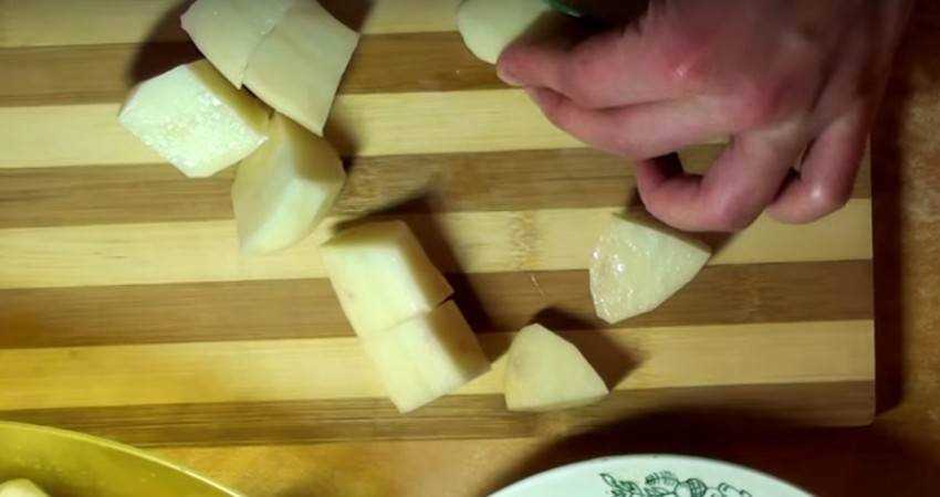 3. Картофель нарежьте крупными кубиками и отправьте его в кастрюлю. Мясо рыбы разберите.