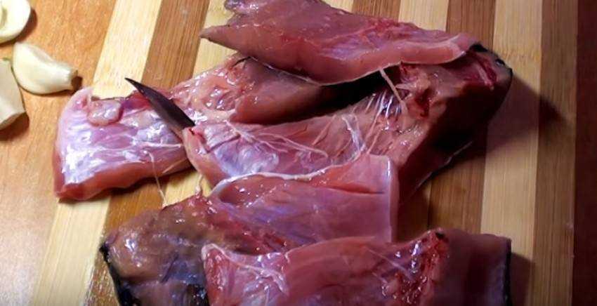Горбушу очистите и выпотрошите. Нарежьте на куски толщиной около 5 см.