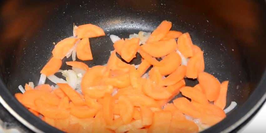 2. Налейте в чашу мультиварки масло, обжарьте лук с чесноком, после чего добавьте морковь.
