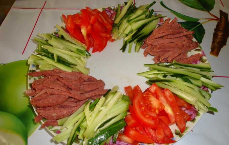 2. Далее нарезаем яйца, картофель, морковь и солёные огурцы. Пытаемся придерживаться одного размера нарезки, т. к. эстетика блюда тоже должна быть на высшем уровне. Готовые продукты складываем к колбасе.