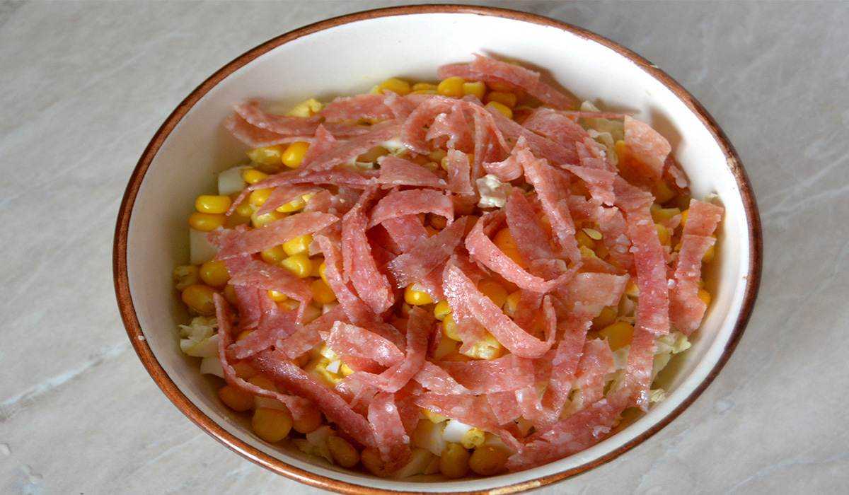 Нарезаем колбасу, как нравится, но нарезанная брусочками колбаска выглядит красивее, а значит, нарезаем её именно так. Отправляем колбасную нарезку к остальным составляющим салата.