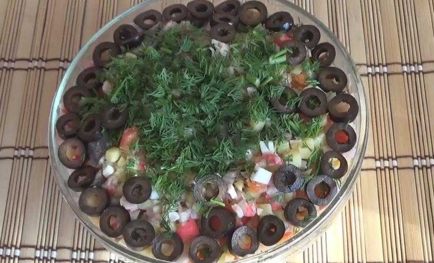 - Соединить все продукты с маслинами, нарезанными колечками. Посолить, заправить растительным маслом и перемешать.