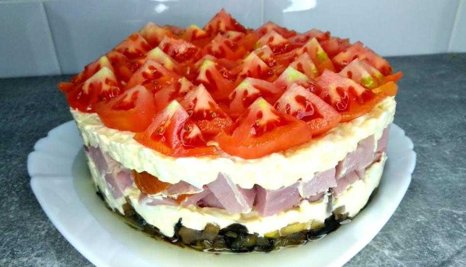 Грузинский салат с колбасой, помидорами и сыром слоями