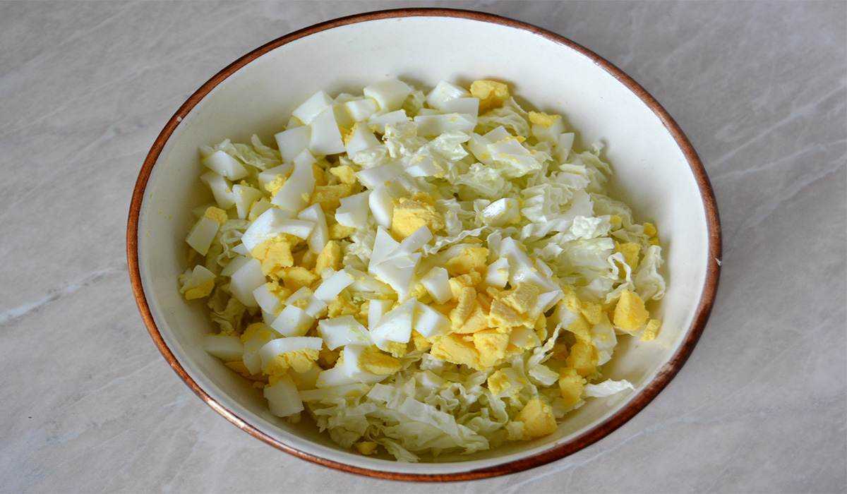 Соединяем измельченные яйца и шинкованную капусту в удобной для перемешивания посуде.