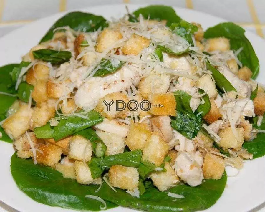 Итак, соус тоже готов, пора собирать салат. Я предпочитаю делать это порционно, не смешивая все сразу в одном котле, чтобы сухарики не раскисали.