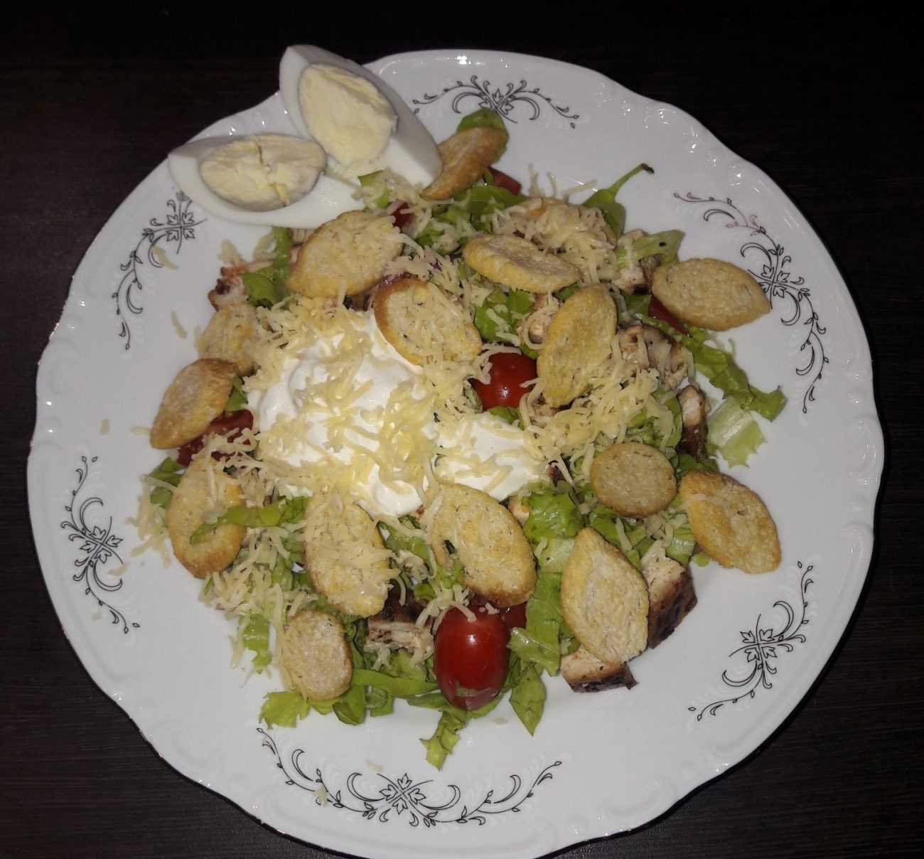 Готовим блюдо для подачи. Выкладываем грудку, листья салата и помидоры черри, добавляем сухарики. Намеренно добавляем сухарики в конце, чтобы они не размягчились, добавляем соус, сверху украшаем тертым сыром и яйцом. Приятного аппетита!