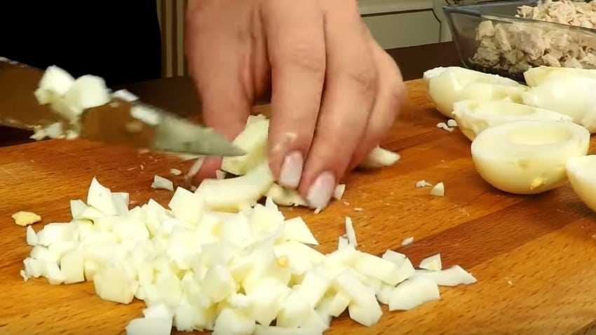 2. Яйца варим вкрутую (около 10 мин) и режем мелкими и равномерными кубиками.