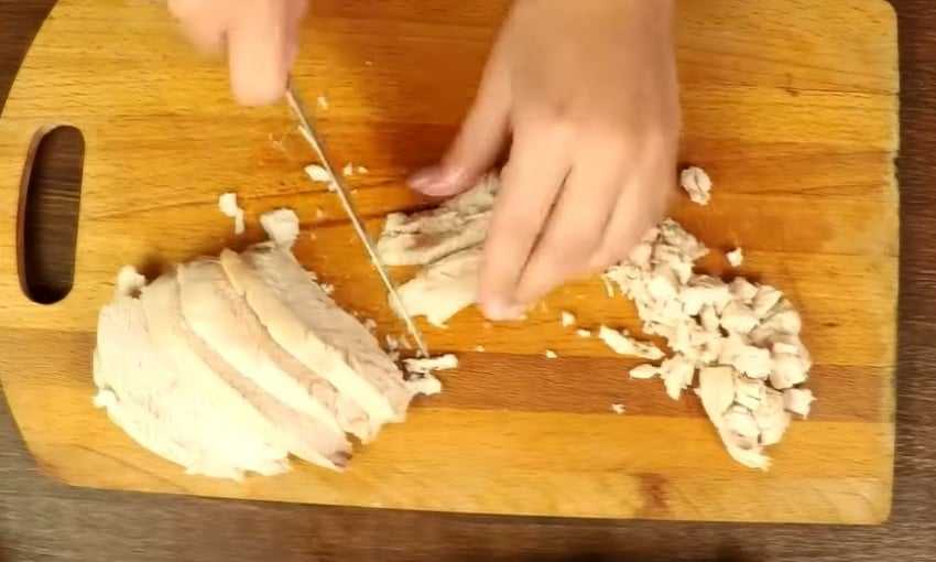 - Отварное мясо курицы очистите от шкурки, отделите от костей, мелко порежьте.
