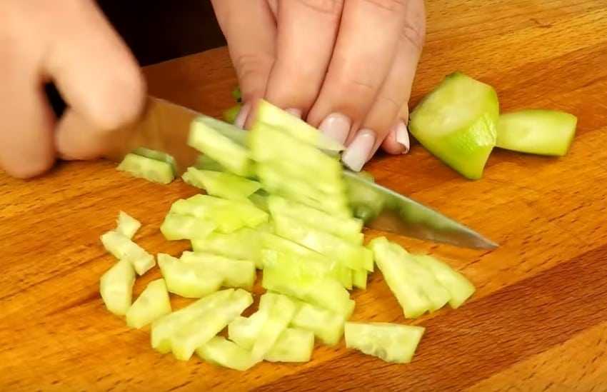 3. Огурцы шинкуем мелко. Попки обязательно удаляем.