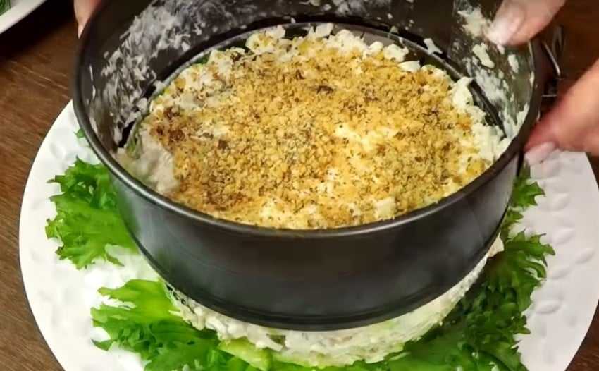 Все слои нужно хорошо промазать майонезом (или сметаной). Чтобы салату придать красивый и приятный вид, воспользуйтесь кулинарным кольцом.