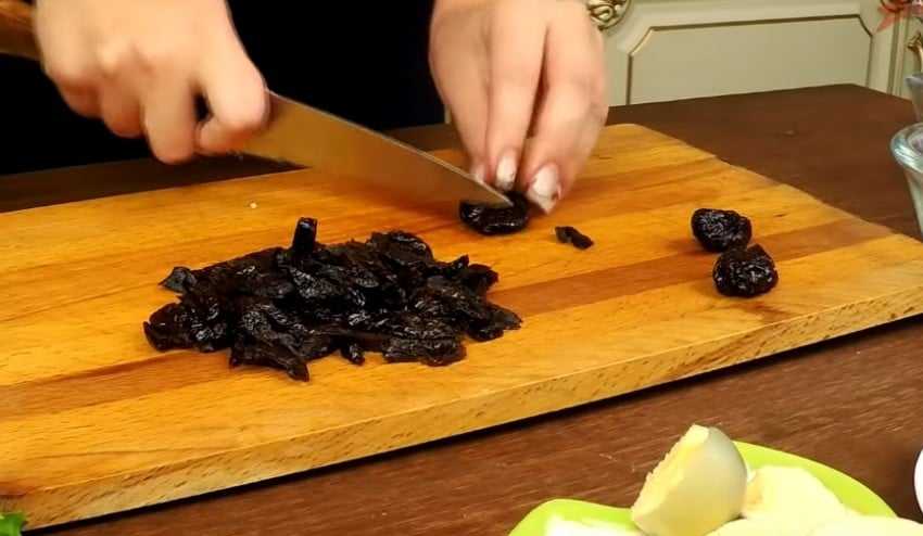 - Ошпаренный кипятком чернослив, лучше взять копчёный, подвергнуть нарезке соломкой.