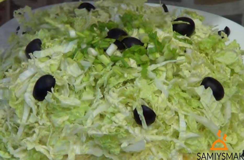 Сверху выкладывают слой пекинской капусты горкой. Сверху и с боков.