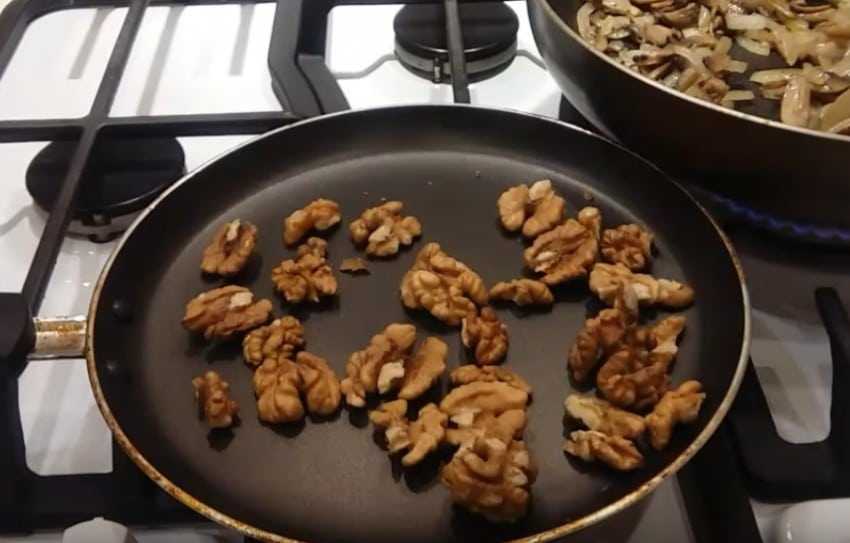 6. Раскалите на огне еще одну сковороду и обжарьте в ней ядра грецких орехов. После обжаривания орехи станут вкуснее и ароматнее.