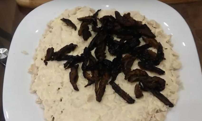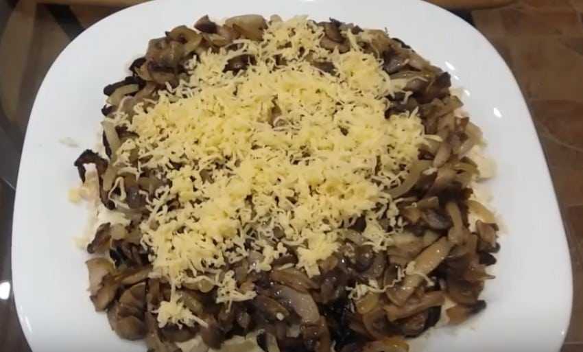 9. Уложите слой грибов с луком. Эти два слоя майонезом смазывать необходимости нет, поскольку в жареных шампиньонах и так много масла.