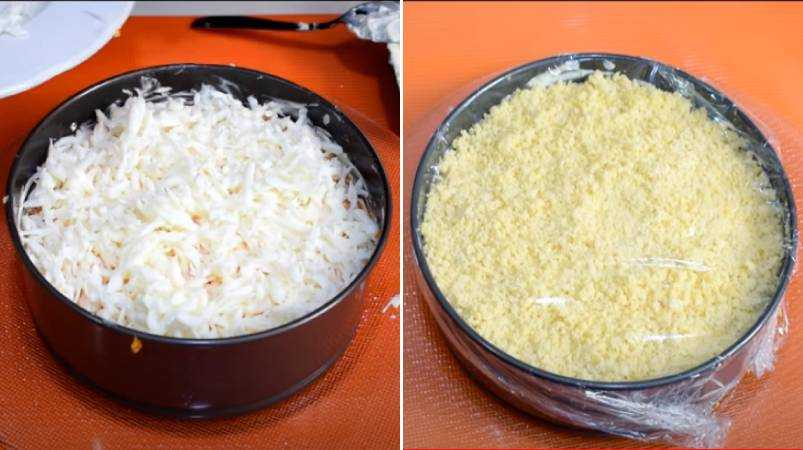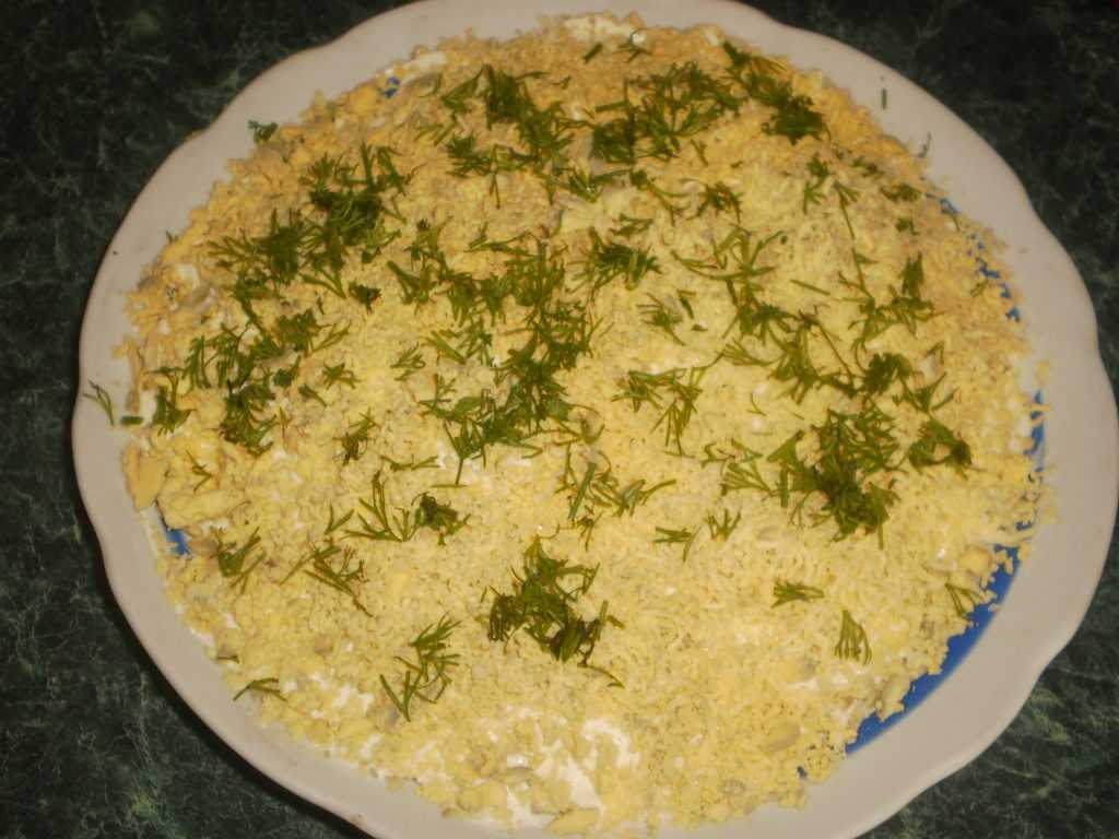 В аутентичном варианте слой тертых желтков идет последним и не имеет на себе украшений. У меня последним слоем пошел сыр лишь слегка усыпанный крошкой желтка. Смотрите рецепт и выбирайте, как вам больше нравится.