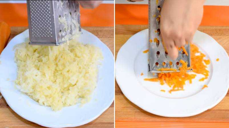 Отваренные заранее картофель и морковь почистим и натрем с помощью мелкой терки в разные тарелки.