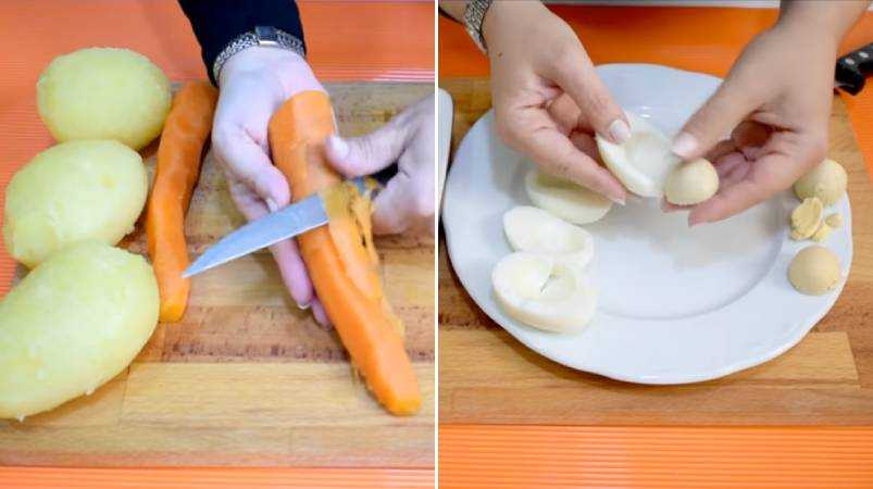 Пока лук маринуется, подготавливаю остальные составляющие — чищу отваренный в мундире картофель и отварную морковь, и конечно же яйца.