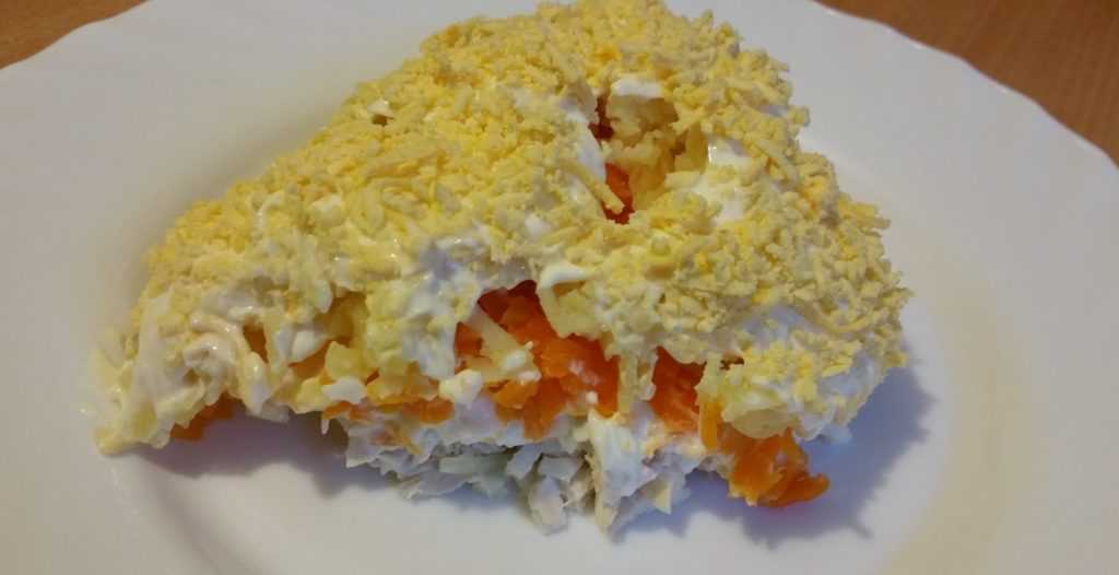 Далее — слой моркови, также смазываем майонезом.Выкладываем белок, равномерно распределяем и снова пропитываем майонезом.