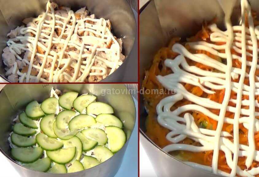 Сверху заправляем сеточкой из майонеза. Затем аккуратно кладем кусочки огурца. Дальше идет морковь и сверху майонез.