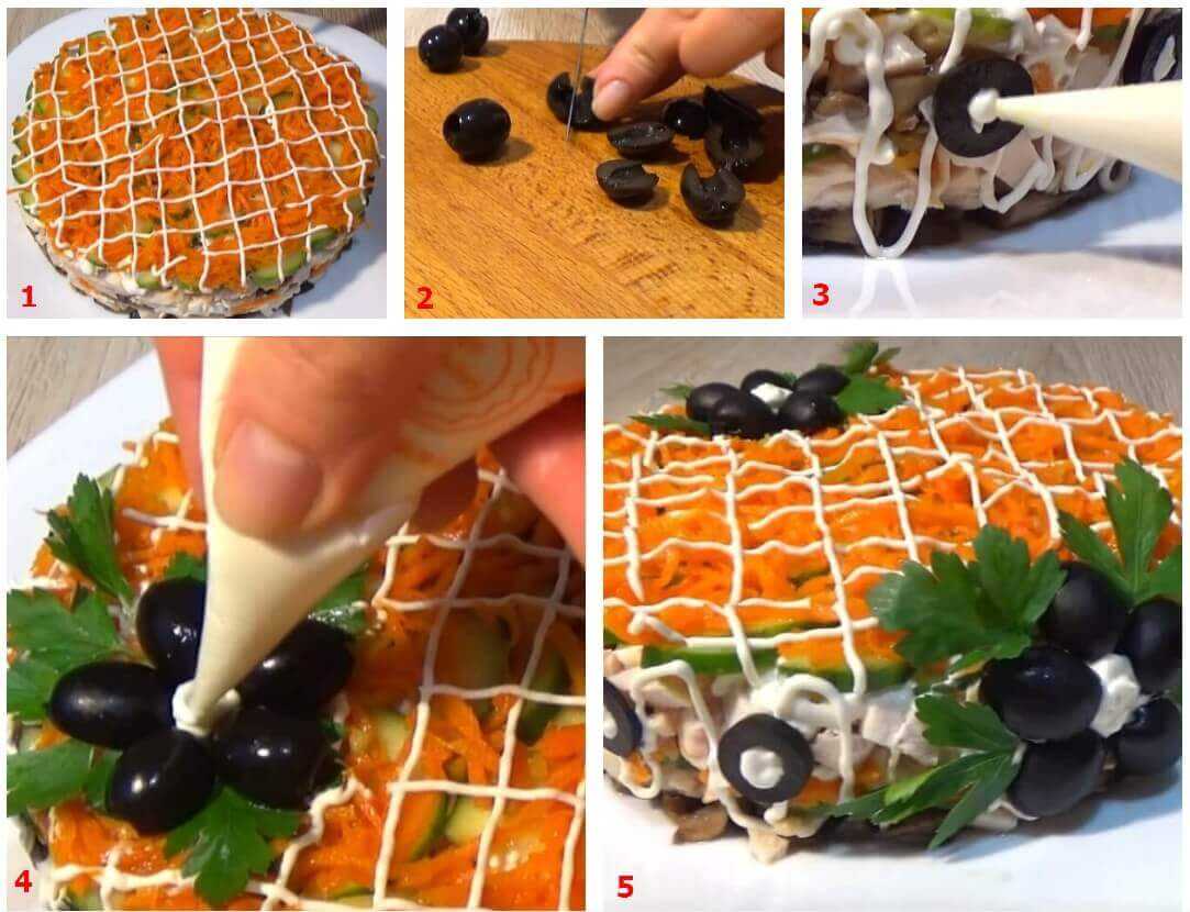 Теперь, когда у нас все ингредиенты готовы, можно собирать блюдо. Сразу скажу, что этот салат Обжорка с курицей и грибами будет идти слоями.