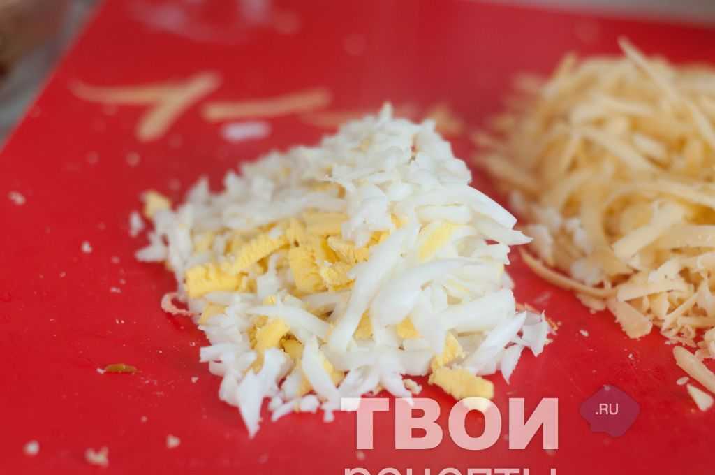 - Отварить яйца курицы, остудить, очистить скорлупу. Отделить белки и желтки, а потом потереть их в разные ёмкости на мелкой тёрке.
