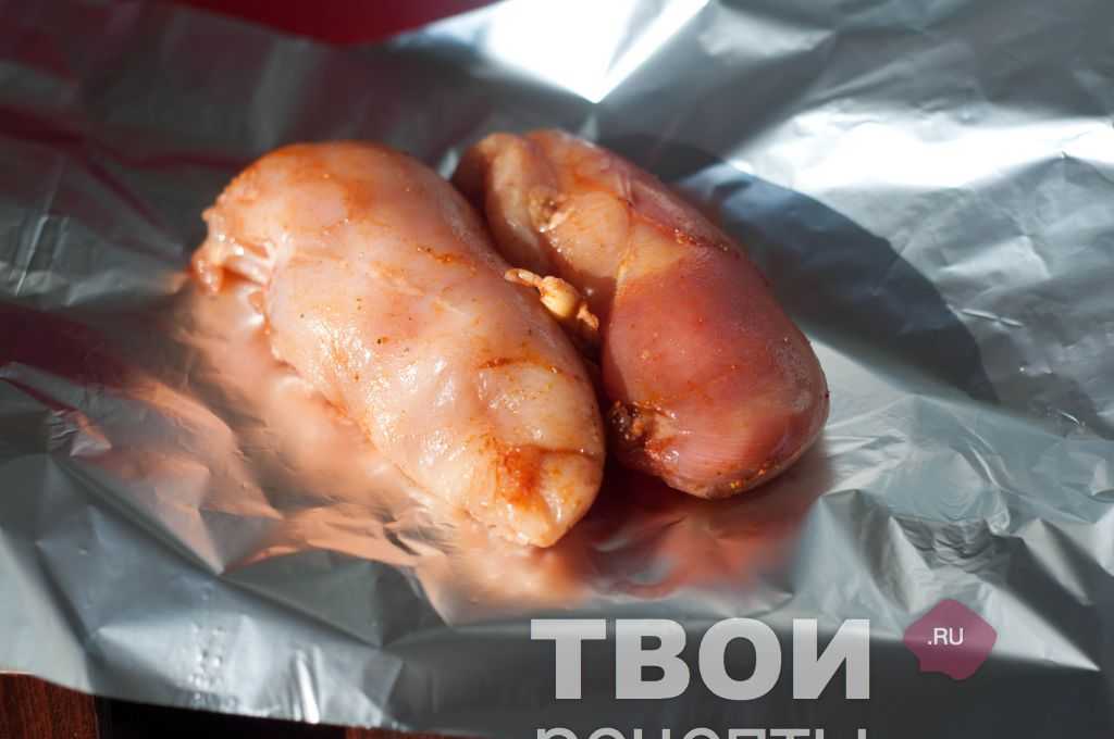 По правилам куриную грудку нужно просто отварить. Но я ее с вечера замариновала в паприке и пряных травах с оливковым маслом.