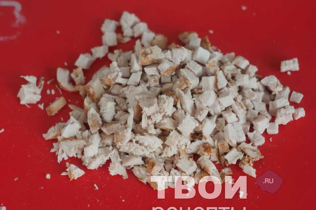 - Мясо курочки следует хорошо вымыть, залить холодной водой, поставить ёмкость с мясом на плиту и до полной готовности отварить. После остудить и нашинковать небольшими кубиками.