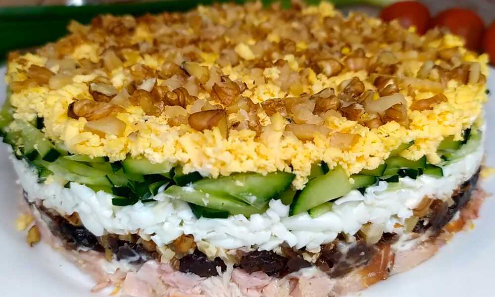 - Выкладывают салат: курицу, майонез, чернослив, орешки, белки, майонезный соус, огурцы, желтки, майонез.