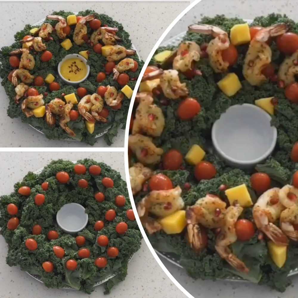 - Соберите венок. На тарелку кругом выложите кудрявую капусту. Сверху по кругу распределите креветки, кубики сыра и помидоры.
