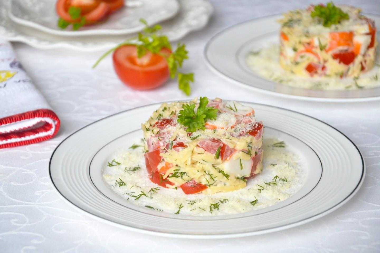 Рецепт 3: слоеный крабовый салат с помидорами и сыром
